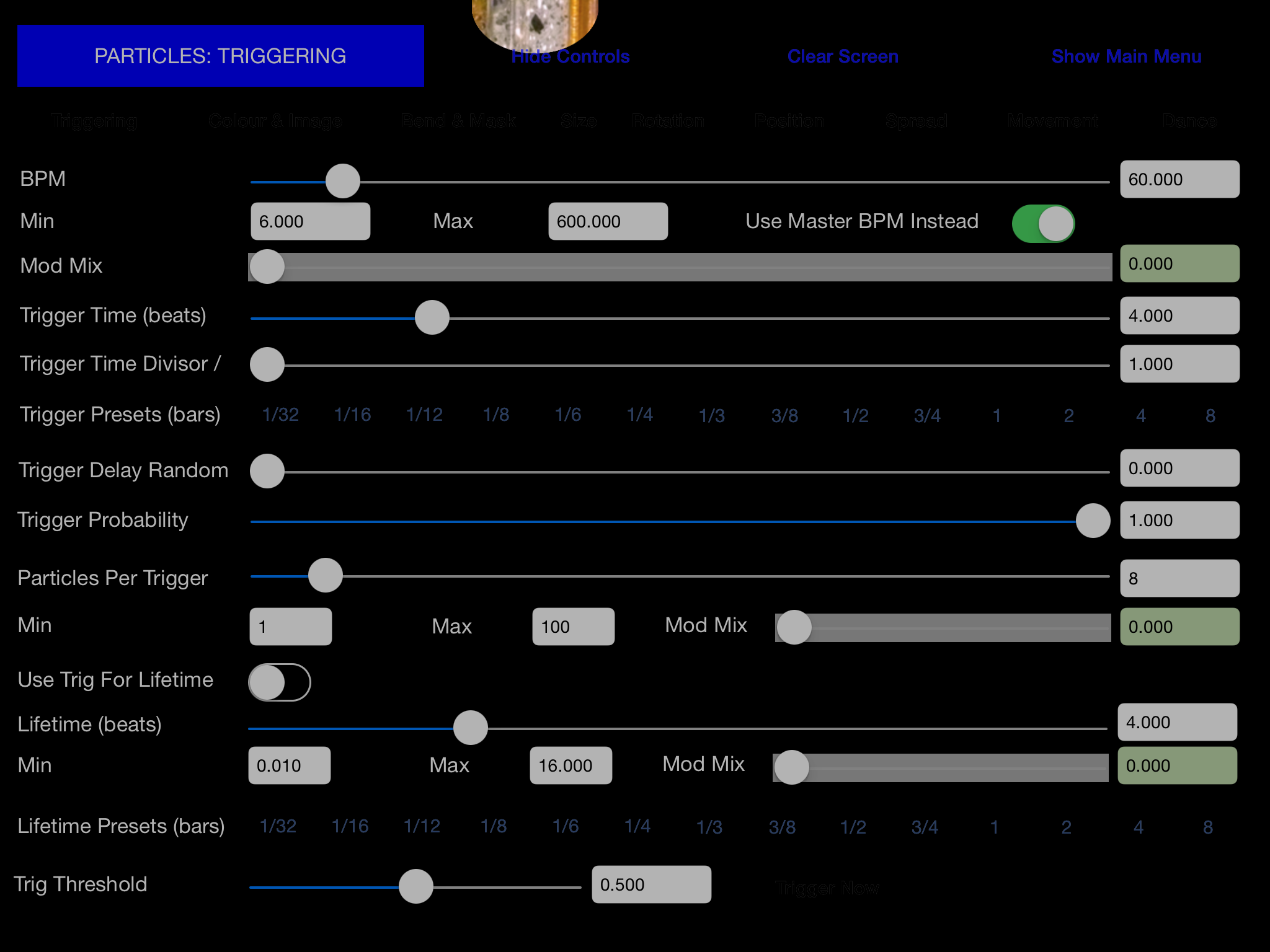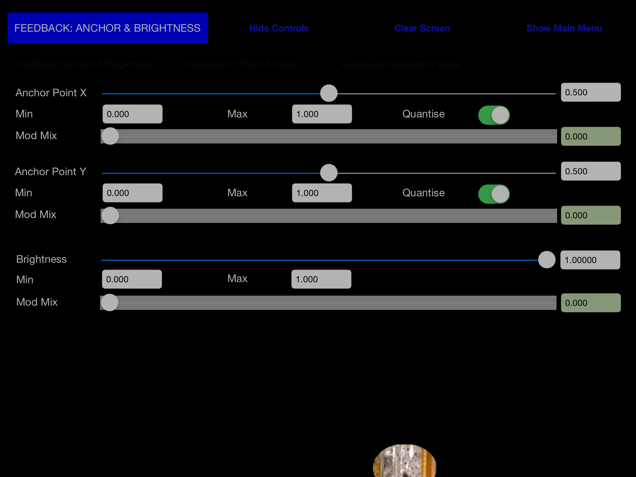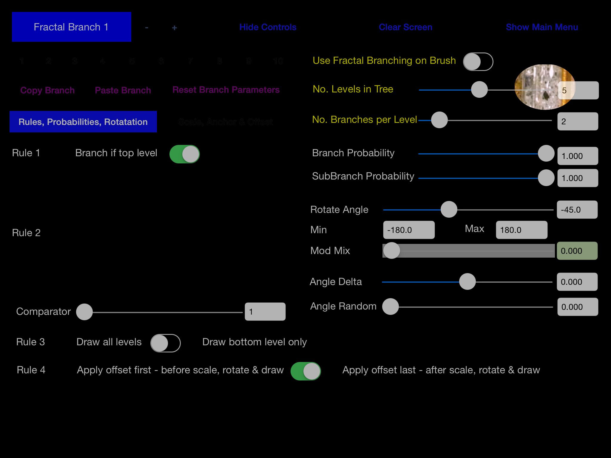 There are many ways in which Pixi can produce surprising and interesting visual results from manipulations of the Brush. Particle systems, such as multiple Brushes, are an enhancement to the program which was a bit like going from a mono to a polyphonic synthesiser. Pixi has a sophisticated Patch Matrix like a modular synth in which Control params e.g. Acceloromoter, LFO, touch control, Perlin noise are assigned to Synth params e.g. brush size, position, alpha, feedback. This enable an infinite number of patches to be constructed, and favourite ones saved.